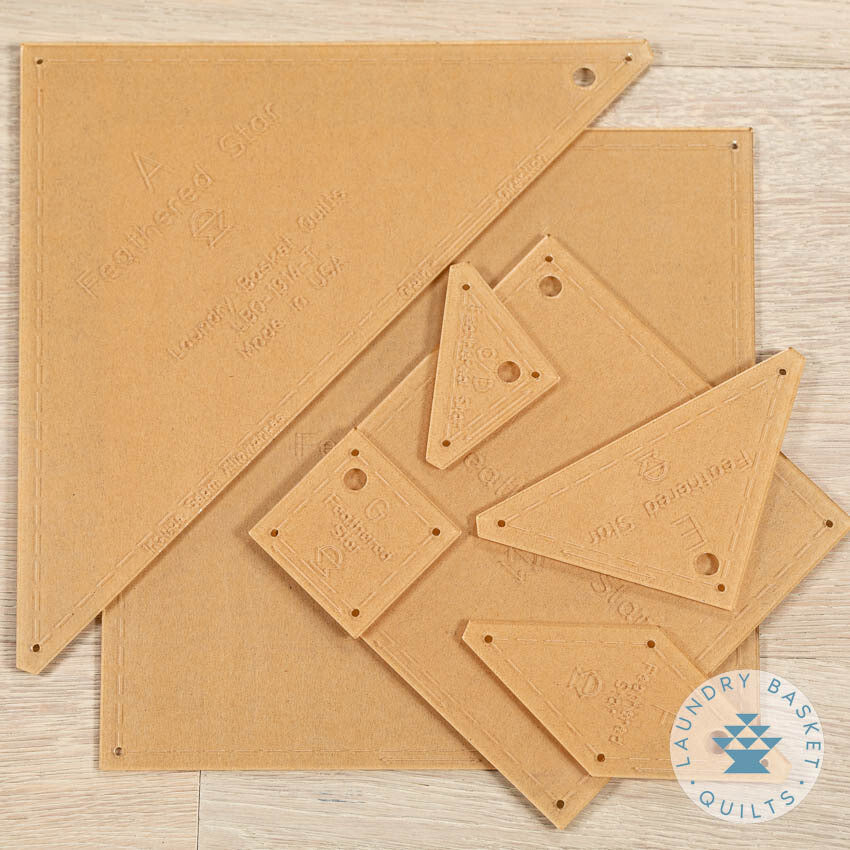 Acrylic Templates for precise cutting and trimming of shapes for our a few of our Laundry Basket Quilt patterns - Feathered Star, Feathered Star Pillow, Sweet Star, and First Flakes. Templates are marked with a ¼" seam allowance points for easy marking and matching of pieces.