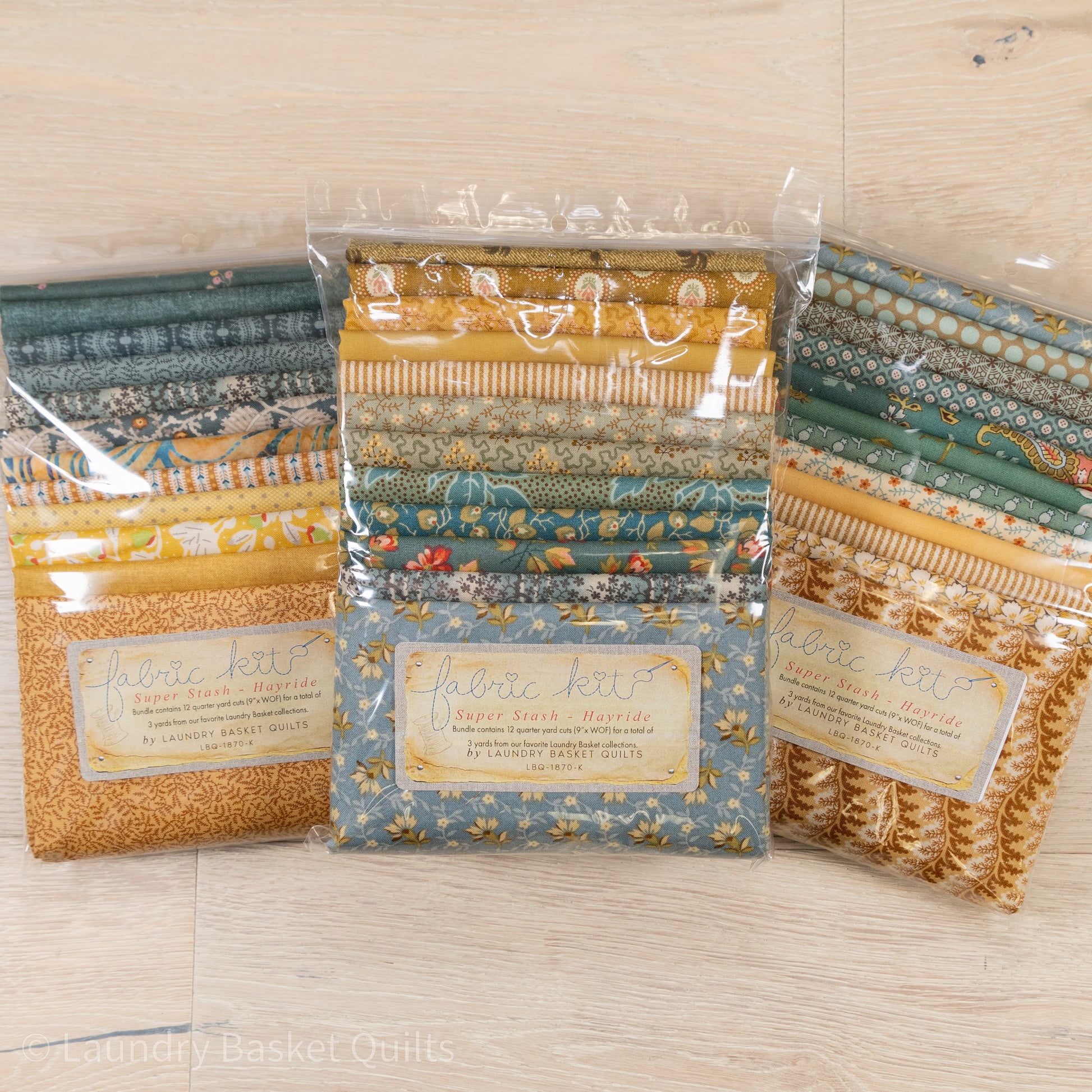 This stunning bundle has a variety of our favorite mustard, sage and spruce fabric colors selected from Laundry Basket Quilt's Best Selling Collections. Curated in house just for you, each bundle is a different assortment of fabrics – no two alike!