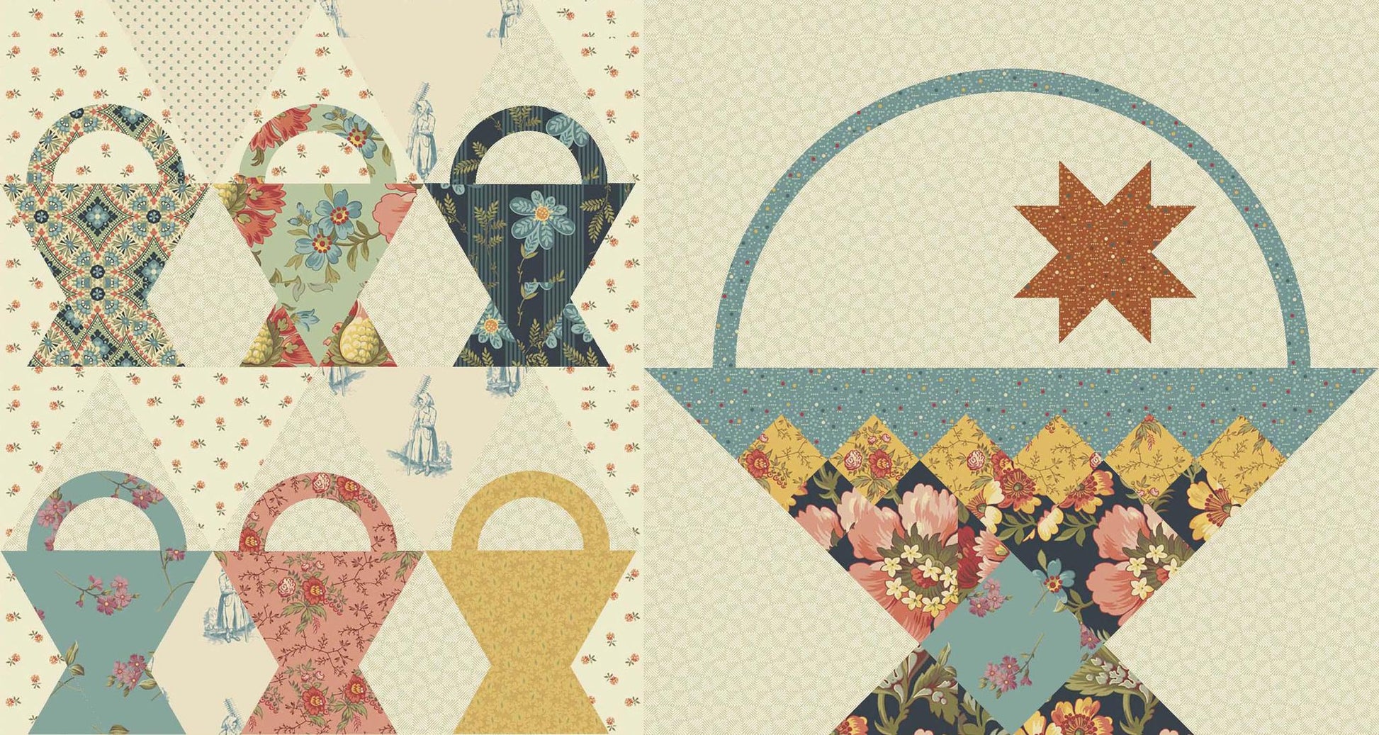 We recommend a Farmers Daughter Half Yard Bundle or your own scraps for making the Anna's Baskets quilt.